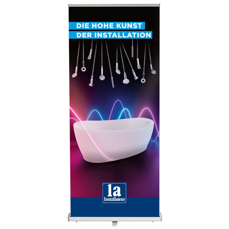 Roll-Up System Classic Plus höhenverstellbar, 1 Standfuß mit Teleskopstange Material: Roll-up-Film Komplettsystem inkl. praktischer Transporttasche